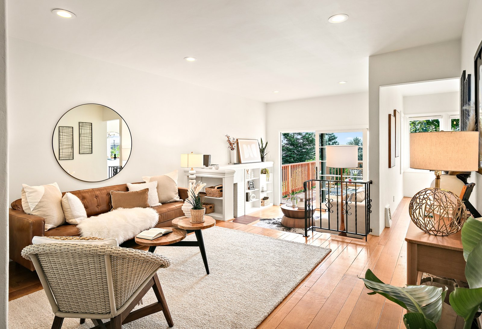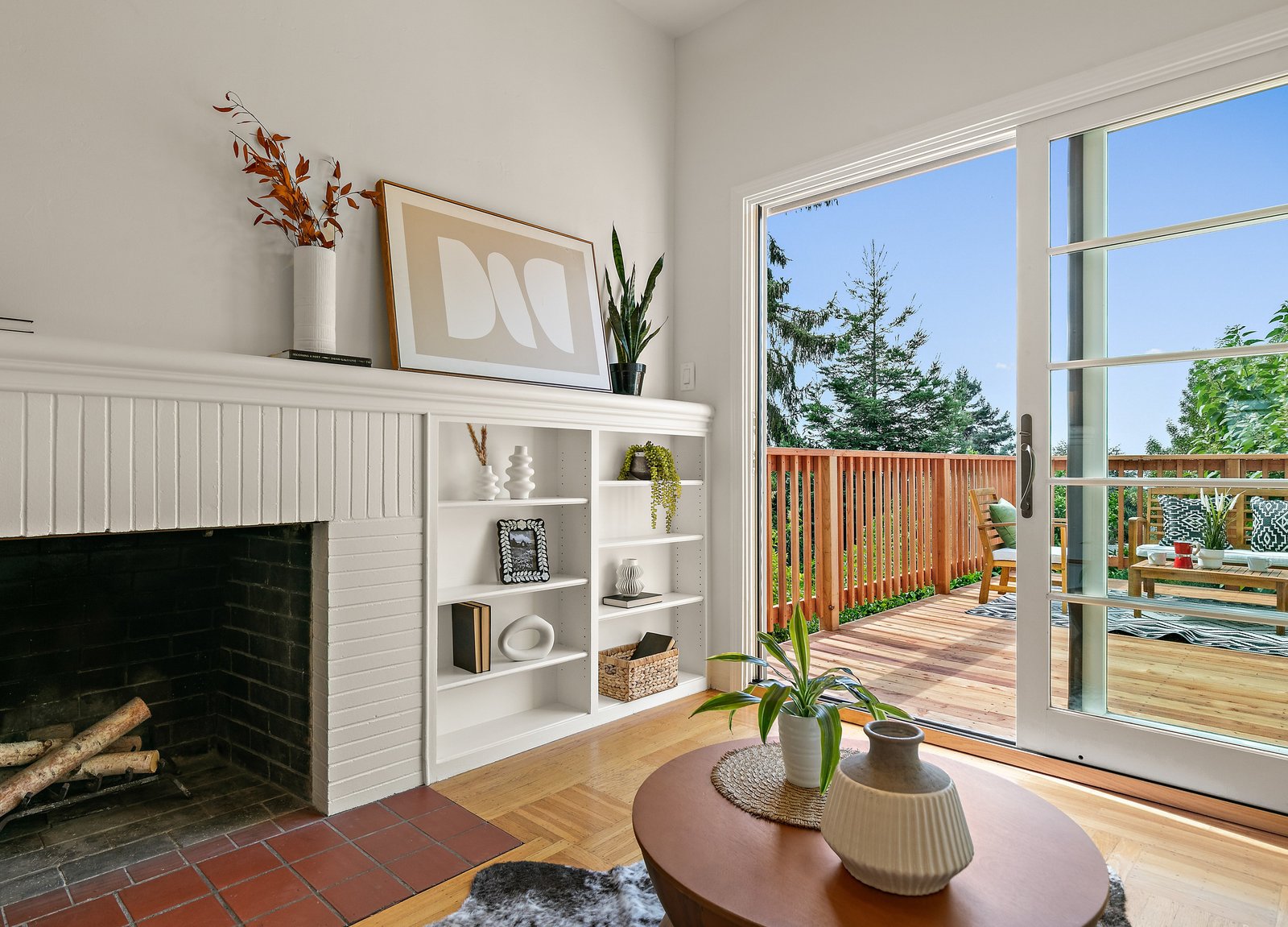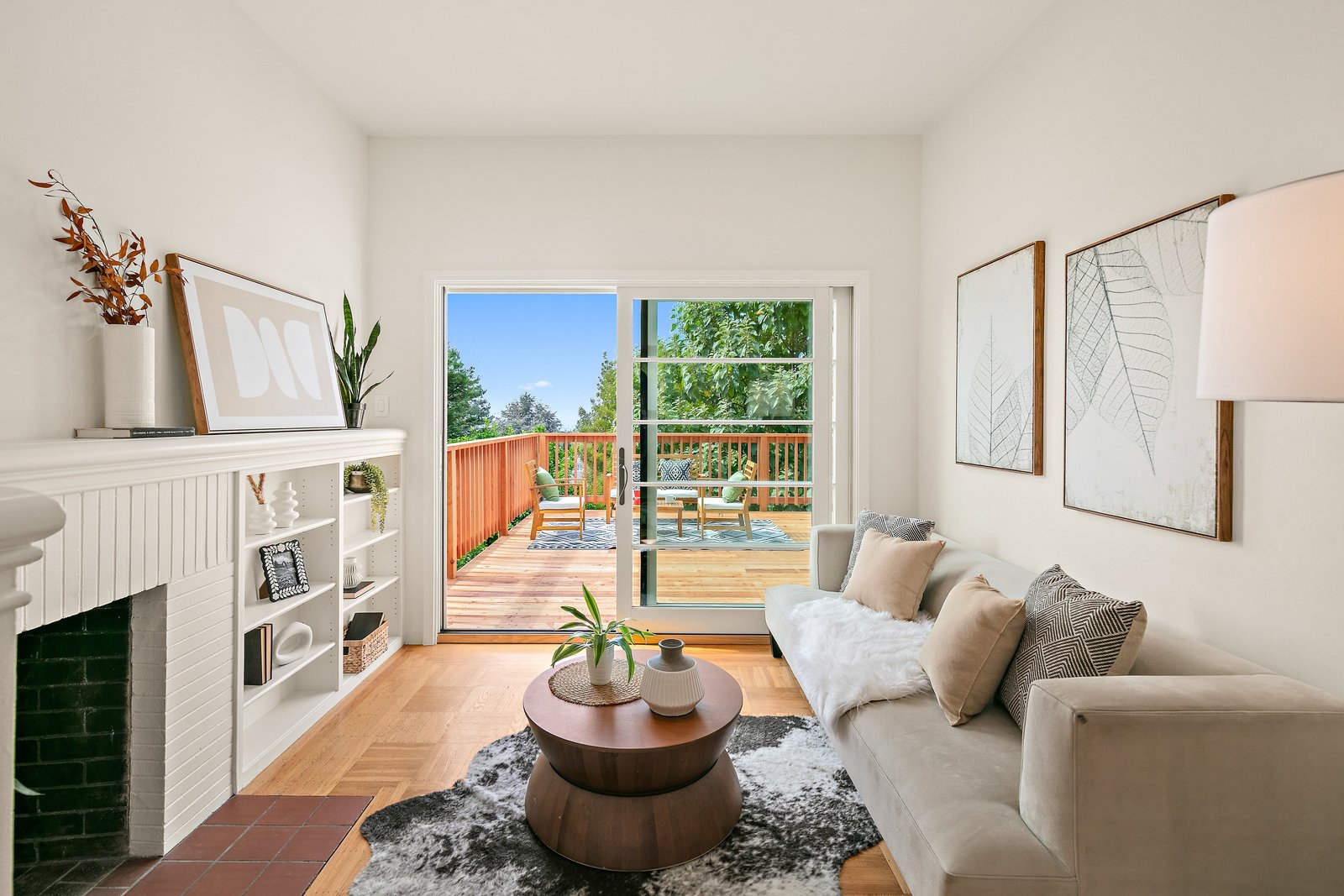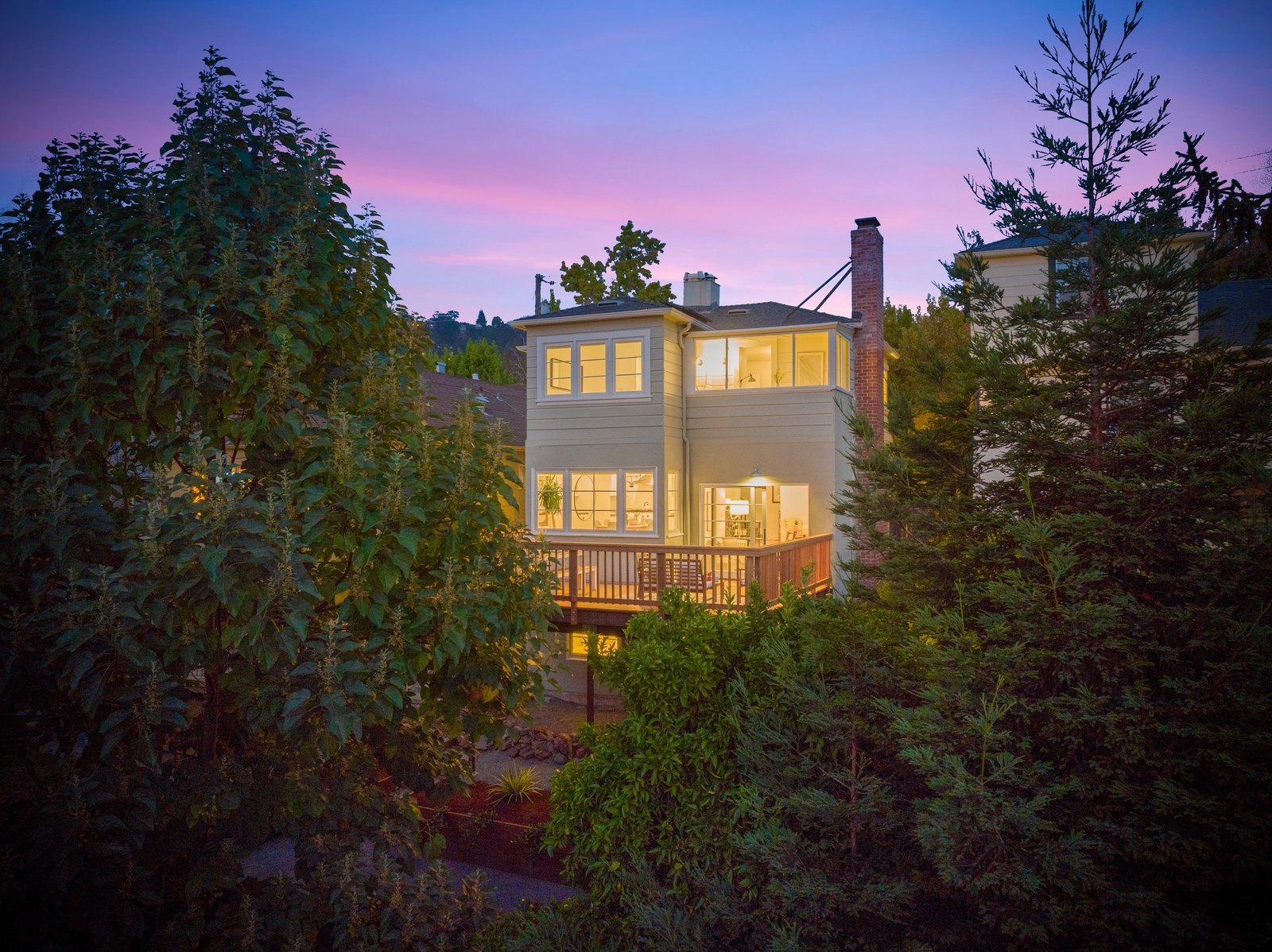The two-level living room, with its hardwood floors and fireplace flanked by bookcases, opens through oversized patio doors to a generous west-facing deck with slices of Bay view, irresistibly inviting for indoor-outdoor living.