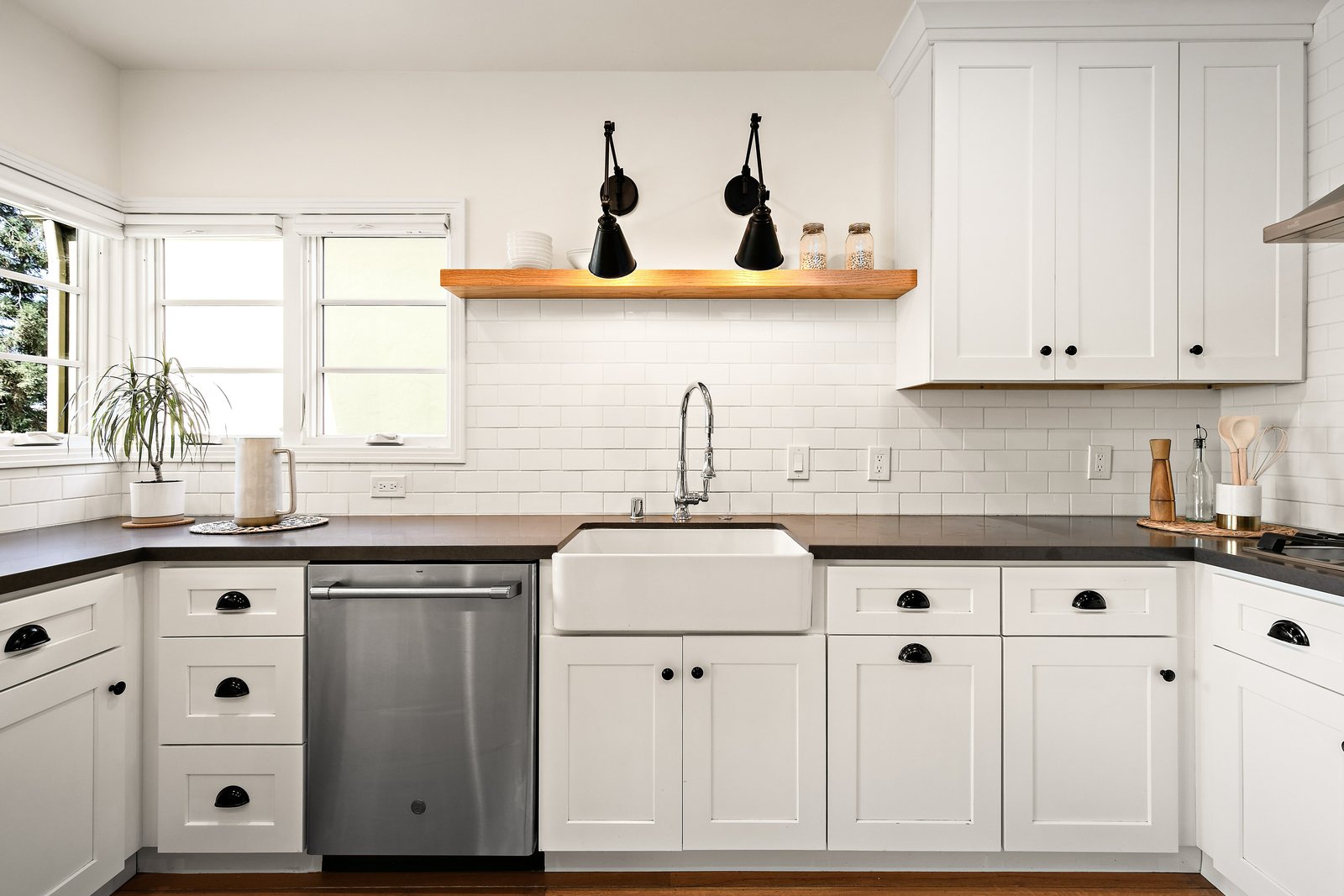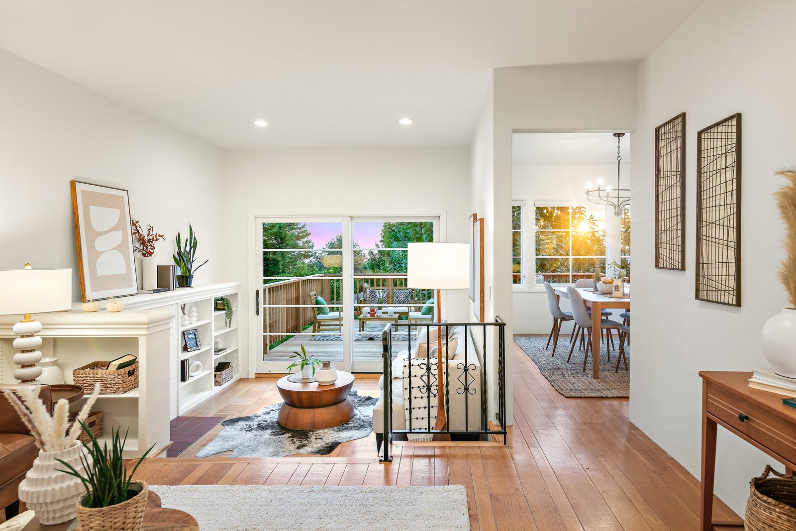 The updated kitchen, with windows framing sunset skies, features a farmhouse sink, gas cooktop, ample storage, and a seamless connection to the dining room.
